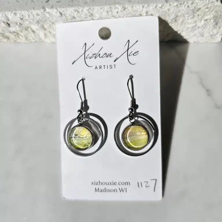 Hand-painted and unique earrings with green irredescent shimmer.